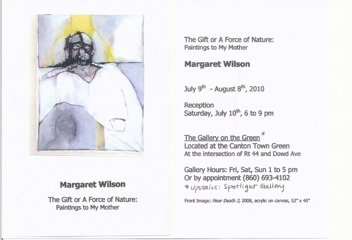 My new show, titled “The Gift or A Force of Nature: Paintings to My Mother,” is currently up and available for viewing through August 8, 2010 at the Gallery on the Green in Canton, CT. Click on the invitation below to enlarge: