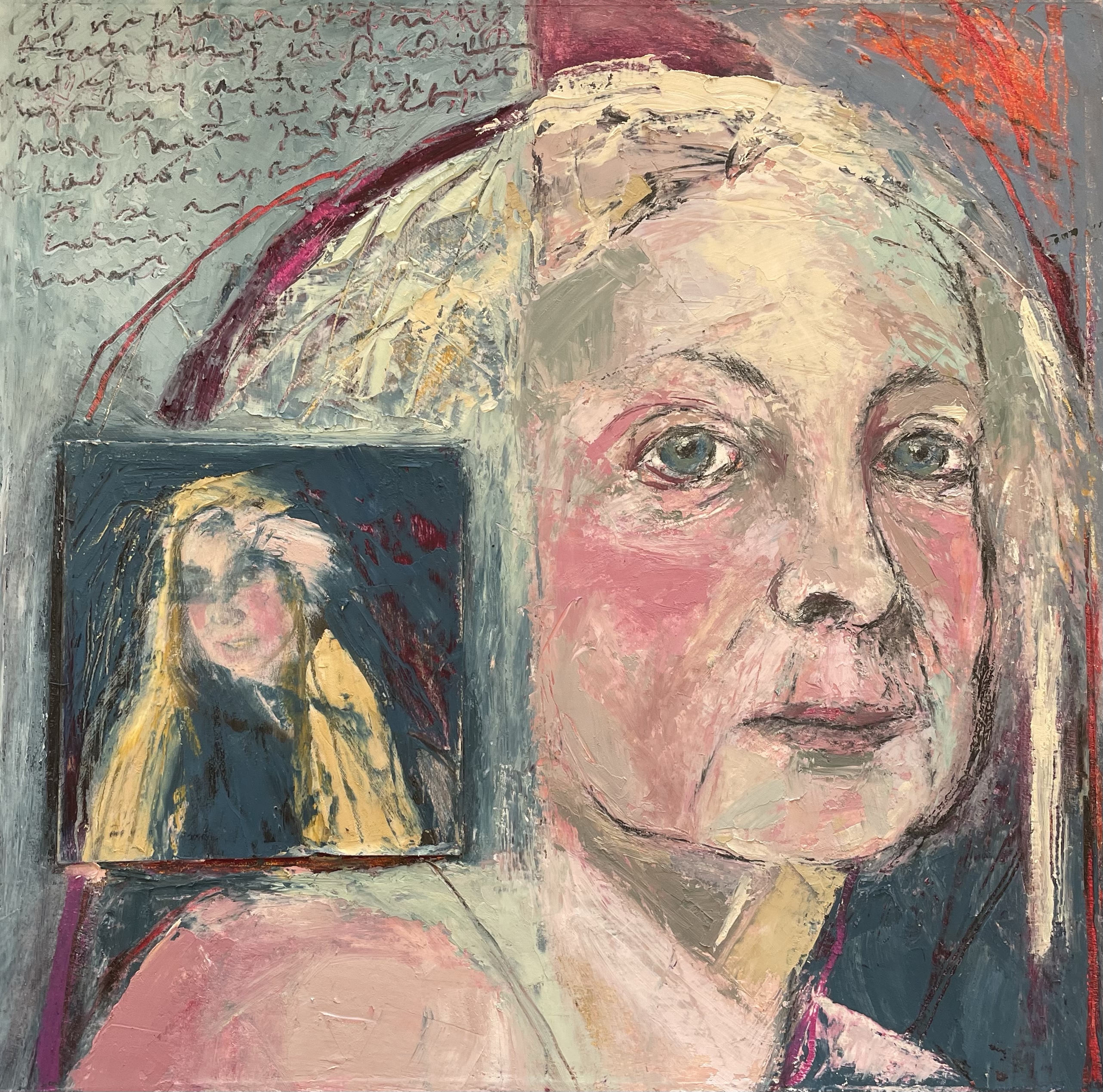 Self Portrait: an Ordinary Woman; 2025; mixed media & oil pastel & oil on paper; 10” x 10”. Lucille Clifton ‘s poem ( in my 38th year) referenced: “ I had not expected to be an ordinary woman”